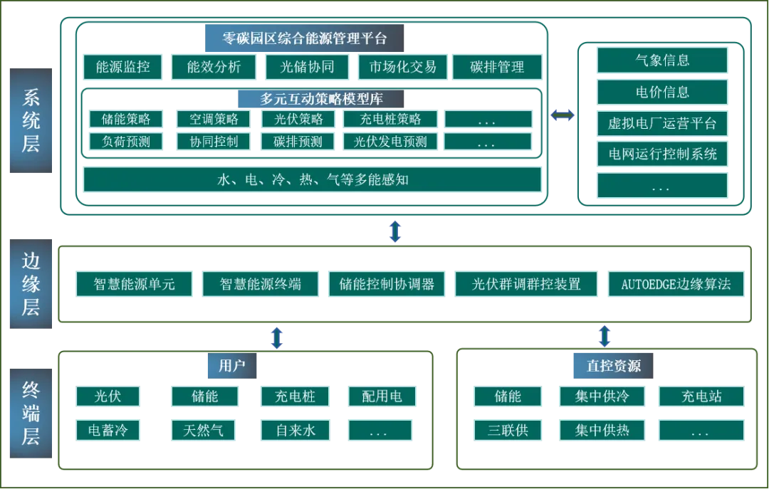 零碳园区综合能源管理平台采用系统层-边缘层-终端层三层架构设计,通过各层级协同联动,实现园区冷、热、电、气等多种能源的高效管控与优化运行。